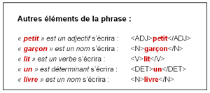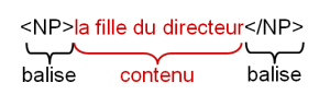« le petit garçon » est un syntagme nominal s'écrira donc : <NP>le petit garçon</NP>