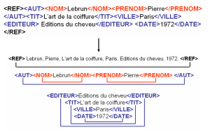 5. Les balises peuvent s'emboîter les unes dans les autres (en anglais, embedding, enchâssement) si nécessaire (par exemple, « auteur » comprendra « nom » + « prénom » ; autrement dit, « nom » et « prénom » seront emboîtés (ou « enchâssé) dans « auteur »