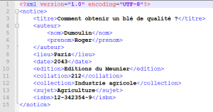 Reprenons le fichier XML que nous avons précédemment constitué pour la notice : <notice><titre>Comment obtenir un blé de qualité ?</titre><auteur><nom>Dumoulin</nom><prenom>Roger</prenom></auteur><lieu>Paris</lieu><date>2043</date><edition>Editions du Meunier</edition><collation>212</collation><collection>Industrie agricole</collection><sujet>Agriculture</sujet><isbn>12-342354-9</isbn></notice> Avant de rédiger une DTD pour ce fichier XML, nous allons d'abord représenter notre fichier sous la forme indentée. |