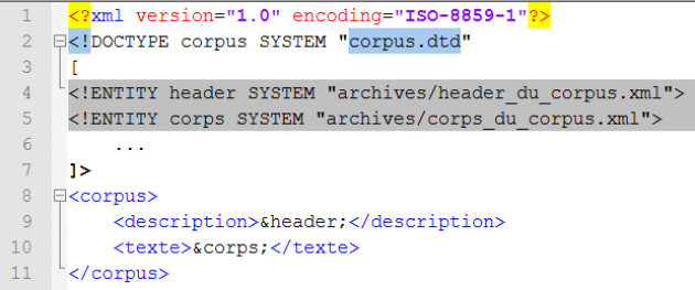 Dans cet exemple, un corpus peut être constitué de deux documents : header_du_corpus.xml et corps_du_corpus.xml. Ce sont deux fichier xml qui se trouvent dans le dossier archives. Le fichier corpus a rassemblé ces deux documents en utilisant des entités générales analysables/parsables. Le parseur XML, suivant le chemin indiqué, importe les fichiers header_du_corpus.xml et corps_du_corpus.xml dans le corpus et les analyse comme un fichier xml bien-formé.