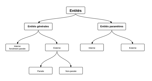 On distingue deux types d'entités en fonction de la déclaration dans le fichier XML, les entités internes et les entités externes :